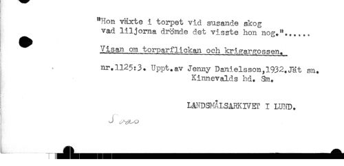 //// "Hon växte i torpet vid susande skog //// vad liljorna drömde det visste hon nog."....., //// t ^^ Visan om torparflickan och krigargossen. //// nr.1125:3. Uppt.av Jenny Danielsson,1932.Jät sn. //// Kinnevalds hd. 3m. //// ! LMDSKåLSåRKIVET I LUHD. ////