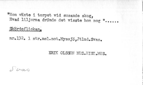 //// "Hon växte i torpet vid susande skog, //// Hvad liljorna drömde det visste hon nog //// s //// Skördeflickax. //// nr.132. i str.mel.not.MyssjöyJtlnd.Svas. //// ERIK OLSSON MUS.HIST.MUS. //// } //// f //// r //// t //// i //// (J I ////