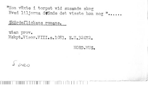 //// "Hon växte i torpet vid susande skog //// Hvad liljorna drömde det visste hon nog //// Skördeflickans romans. //// utan prov. //// Mskpt^Visor.VIII.s.1031. E.U.32072. //// NORD .MUS* ////