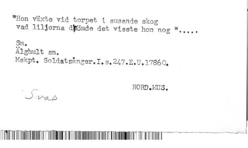 //// "Hon växte vid torpet i susande skog //// vad liljorna djpomde det visste hon nog *..... //// Sm. //// Alghult sn. //// Mskpt. Soldatsånger.I,S.247.E.U.17860. //// NORD.MUS. //// tnn^^^^^ -----^------ ////