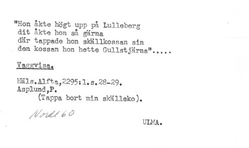 //// "Hon åkte högt upp på Lulleberg //// dit akte hon så gärna //// där tappade hon skällkossan sin //// den kossan hon hette Gullstjäma"..... //// Vap;orvisa. //// Häls.Alft a,2295:1.s.28-29. //// Asplund,?. //// (Tappa bort min skälleko). //// ULMA. ////