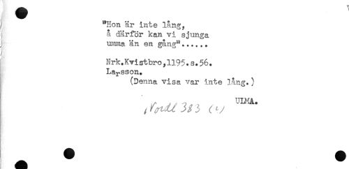 //// "Hon är inte lång, //// å därför kan vi sjunga //// uinma än en gång"...... //// Nrk.Kvi stbro,1195.s.56. //// Layssoii. //// (Denna visa var inte lång.) //// ULMA. //// (V ////