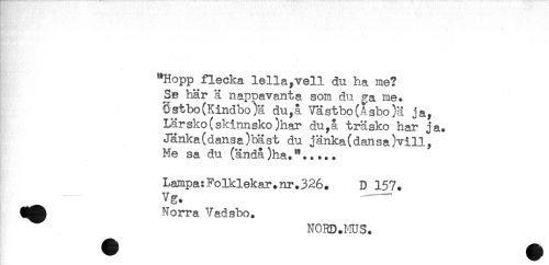 //// : //// "Hopp flecka lella,vell du ha me? //// Se här ä nappavanta som du ga me. //// Ostbo(Kindbo)ä du,å Västbo(Asbo)ä ja, //// Lärsko(skinnsko)har du,å träsko har ja. //// Jänka(dansa)bäst du jänka(dansa)vill, //// Me sa du (ändå)ha."..... //// Lampa:Folklekar.nr.326. D 157. //// : — vg. -—' //// Norra Vadsbo. //// NORD.HUS. ////
