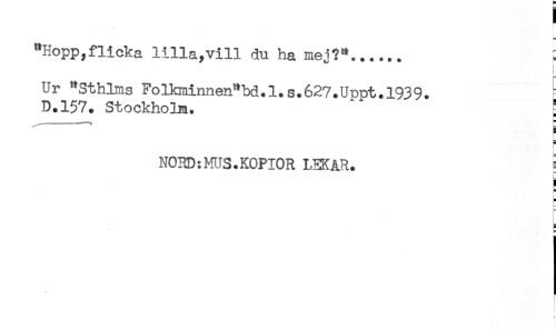 //// "Hopp,flicka lilla,vill du ha mej?"...........: //// Ur "Sthlms Folkminnen"bd.1.s.627.Uppt.1939. * //// D.157. Stockholm. ** ' //// ' L //// = //// NORD:MUS.KOPIOR LEKAR. ! //// i //// t- //// H //// 5 //// H) //// < ////