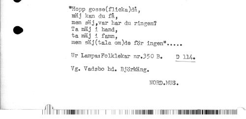 //// "Hopp gosse(flicka)då, //// mäj kan du få, //// men säj,var har du ringen? //// Ta mäj i hand, //// ta mäj i famn, //// men säj(tala om)de för ingen"..... //// Ur Lampa:Folklekar nr.350 B. D 114+ //// Vg. Vadsbo hd. Bjorkäng. //// HORD.MUS. //// _ .............. //// ........... ^ 111 i^nmHiiiiniiiimiiiiiiiiiii 11 in iiiiiiiiiiiiiiiiiiiiiiimiiiiimiiiiiH^^^^^^ ////
