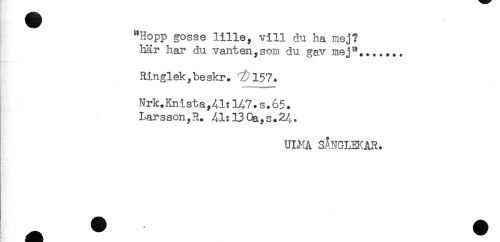 //// "Hopp gosse lille, vill du ha mej? //// här har du vanten,som du gav mej"....... //// Ringlek,beskr. <%?157. //// Nrk.Knista,4.1:H.7.s.65. //// Larsson41:13Qa,s.24. //// ULKÅ SANGLEKAR. ////