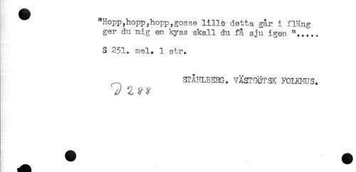 //// ^Hopp,hopp,hopp,gosse lille-detta går i fläng //// ger du mig en kyss skall du få sju igen //// S 251. mel. 1 str. //// STÅHLBERG. VÄSTGÖTSK FOLKMUS. //// T ////