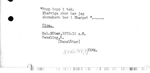 //// "Hopp hopp i tak. //// Slarviga skor har jag //// ^ skomakarn bor i Skärpet //// Visa. //// Dal.Sater,3572:12 s.8. //// Hessling,K. //// (Danslåtar) ////