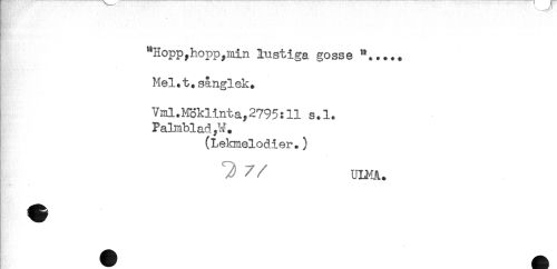 //// "Hopp,hopp,min lustiga gosse //// Mel.t.sånglek. //// Vml.Möklinta,2795:11 s.1. //// PaMblad^W. //// (Lekmelodier.) //// ^ 7/ ULMA. ////