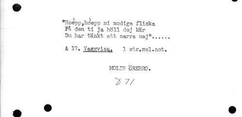 //// "Hoepp,hJepp mi modiga flicka //// På den ti ja höll dej kär //// Du har tänkt att narra mej"...... //// A 17. Vaggvisa. 1 str.mel.not. //// MOLIN CREBRO. //// ^ 7/ ////