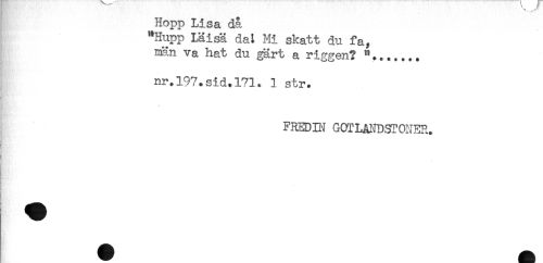 //// Hopp Lisa då //// "Hupp Läisä da: Mi skatt du fa, //// män va hat du ^rt a riggen? "....... //// nr.197.sid.171. 1 str. //// FREDIN GOTIJUJDSTONER. //// j //// i //// ! ////
