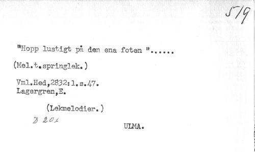 //// t*Hopp lustigt på den ena foten //// (Mel.t. springlek.) //// Vml.Hedy2832:l.s.47. //// Lagergren^E. //// (Lekmelodier.) //// ULMA. i ////