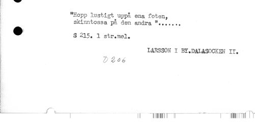 //// "Hopp lustigt uppå ena foten, //// skinntossa på den andra //// ^ S 215, 1 str.mel. //// LARSSON I BY.DALASOCKEH 11. //// . ////