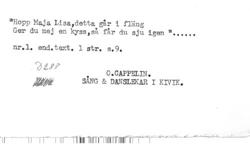 //// "Hopp Maja Lisa,detta gar i fläng //// Ger du mej en kyss,så får du sju igen "...... //// nr.l. end.text. 1 str. s.9. //// O.CAPPELIN. //// SANG & DANSLEKAR I KIVIK. ////