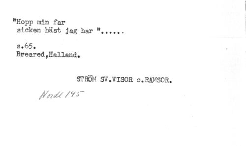 //// "Hopp min far //// sieken häst jag har //// s+65. //// Breared,Halland. //// STRÖM SV.VISOR o.RM^SCR, ////