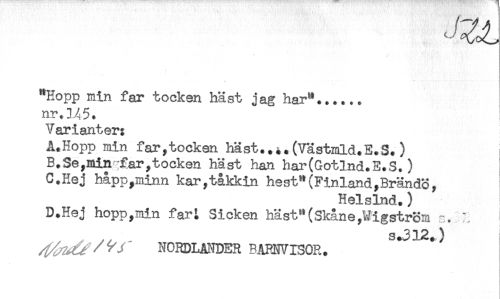 //// "Hopp min far töcken häst jag har"...... //// nr.145. //// Varianter: //// A.Hopp min far,töcken häst..4.(Västmld.E.S.) //// B.Se,min far,töcken häst han har(Gotlnd.E.S.) //// C.Hej håpp,minn kar,tåkkin hest"(Finland,Brandö, //// Helslnd.) //// D.Hej hopp,min farL Sicken häst"(Skåne,Migstrom ;; //// s#312^) //// NORDLANDER BARNVISOR. ////