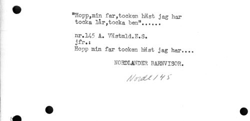 //// "Hopp, min far, t o eken hast jag har //// tooka lår,tocka ben"...... //// * //// nr. 145 A. Västmld.E.S. //// jfr.: //// Hopp min far töcken bäst jag har.... //// NORDLANDER BARNVISOR. //// /X ^ / ^ 3 //// ^ H å ////