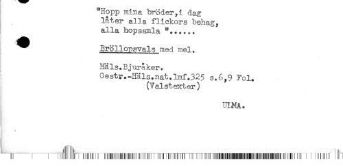 //// "nopp mina bröder,i dag //// låter alla flickors behag, //// alla hopsamla //// ^^ Bröllopsvals med mel. //// Häls.Bjuråker. //// Gesty+-HS,ls.nat.lmf.325 s.6,9 Fol. //// (Valstexter) //// uim * //// ! //// * //// ' tu i i im! h iiiminin iiiiiiiiiiiiiiiiiiiiiiiii^ 11 mimn ////