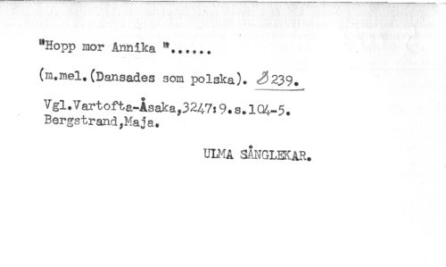 //// "Hopp mor Annika //// (m.mel. (Dansades som polska). <^239. //// Vgl.Vart,ofta-Åsaka,3247:9. s. 104-5. //// Bergstrand,Maja. //// ULMA SANGLEKAR. ////