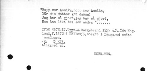 //// "Hopp mor Annika,hopp mor Annika, //// lär din dotter att dansai //// Jag har så gjort,jag har så gjort, //// Hon kan lika bra som andra //// IFGH 267CLi7.Uppt.A.Bergstrand 1932 eft.Ida Hög- //// lund,f.1870 i Töllesjö,bosatt i Långared seden" //// I ungdomen. //// Vg. D 239. //// Långared sn. //// ^ NORD.HUS. ////
