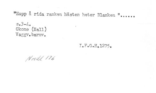 //// "Hopp å rida ranken hästen heter Blänken //// s.3-4. //// Okome (Hall) //// Vaggv.barnv, //// I.F.G.H.1275. ////