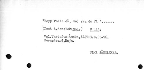 //// "Hopp Pelle då, mej ska du fä ..... //// (Text t.danslek:mel.) D 114. //// Vgl.Vartofta-Asaka,3247:9.s.95-96. //// Bergstrand,Maja. //// ULMA ,5ANGLEKAR. ////
