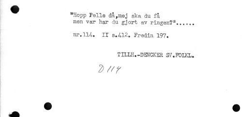 //// "Hopp Felle då,mej ska du få //// men var har du gjort av ringen?^...... //// ' //// nr.114. ir s.412. Fredin 197. //// L * //// TILLH.-DEMCKER SV.FOLKL. ////
