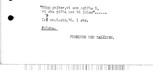 //// "Hopp pojker,vi som ogifta ä, //// vi^ska gifta oss tä julae"...... //// ^ nr.8.sid.76. 1 str. //// Polska. //// FORELUND HED DALALVEN. ////