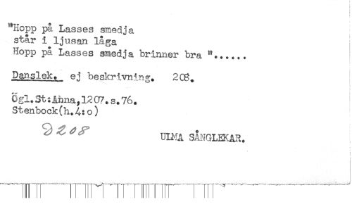 //// I //// i //// *'Hopp på Lasses smedja //// står i ljusan låga //// Hopp på Lasses smedja brinner bra ".+.... //// Danslek, ej beskrivning. 2(8. //// 0gl.St:åhna,1207.s.76. //// Stenbock(h.4.:o) //// ^ ^ ^ ULMA SÅNGLEKAR. //// ! //// i ////