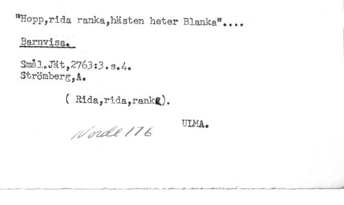 //// "Hopp,rida ranka,hästen heter Blanka".... //// Barnvisa. //// Smal.Jät,2763:3.s.4. //// Strömberg,A. //// ( Rida,rida,rank^). ////