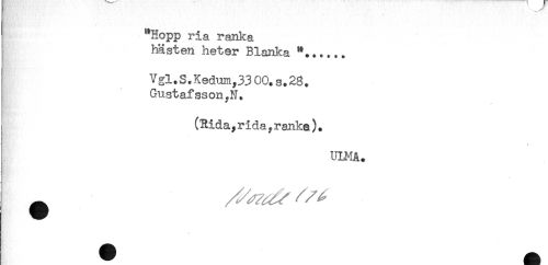 //// "Hopp ria ranka //// ) hästen heter Blanka //// I Vgl.S.Kedum,33 00. s.28. //// I Gustafsson^N. //// i (Rida, rida, ranke). //// ULMA. ////