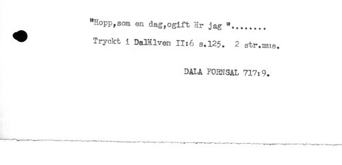 //// "Hopp,som en dag,ogift är jag ____ //// ^ Tryckt i Dalälven 11:6 s.125. 2 str.mus. //// DALA FORNSAL 717:9. //// — ------—----——------- ---^ , ////