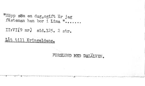 //// "Hopp söm en dag,ogift är jag //// fästeman han bor i Lima "....... //// II:VI(9 nr) sid.125. 2 str. //// . t //// Låt till Krin^eldans. //// FORSLUND MED DALÄLVEN. //// —-------,------- - _ . . ____ _______ ___ ^ ^ ___ ____ _^ ////