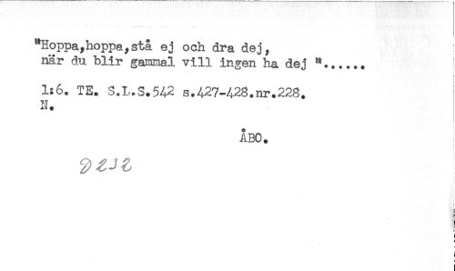 //// "Hoppa,hoppa,stå ej och dra dej, //// när du blir gammal vill ingen ha dej //// ! //// 1:6. TE. S.L.S.542 s.427-428.nr.228. //// N. //// ÅBO. //// < //// ! //// i //// <it //// § //// 3 //// [ //// t ////