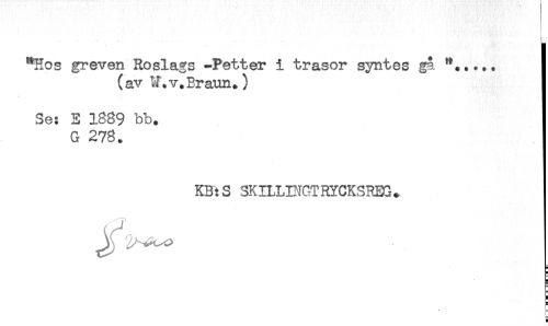 //// "Hos greven Roslags -Petter i trasor syntes ga "..... //// (av W.v.Braun.) //// Se: E 1889 bb. //// G 278. //// KB* S SKILLINCTRYCKSREG. //// < //// i //// * ////
