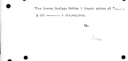//// ^^ "Hos Greven Roslags Petter i trasor syntes ga //// A A65 —--—-- 6 str,mel.kom. //// RÅ. //// * ////