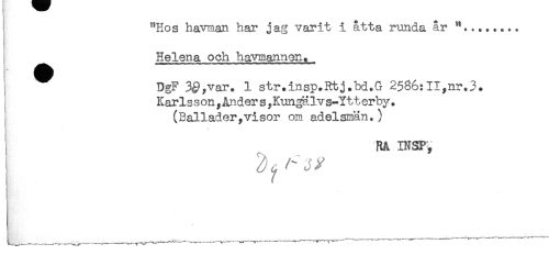 //// "Hos havnian har jag varit i åtta runda år //// I Helena och havmannen. //// ! ^ DgF 3^,var. 1 str.insp.Rtj.bd.G 2586:II,nr.3. //// , Karlsson,Änder s ,Kun#lvs-Ytt erby. //// I (Ballader,visor om adelsmän.) //// ! Rå INSP^ //// i ^^ ////