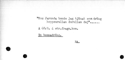 //// * . / //// "Hos Jarunda bonde jag tjänat som dräng //// hoppsurullan durullan dej"...... //// A 68:9. 4 str.fragia.kom. //// En bonnadräna;. //// RA. ////