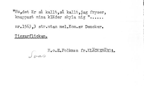 //// "Hu,det är sa kallt,så kallt,jag fryser, //// knappast mina kläder skyla mig \..... //// nr.1563,3 str.utan mel.Kom.av Dencker. ^ //// < //// < //// Tiggarflickan. //// H.o.E.Folkm:n fr.KLÄCKEBARGA. ////