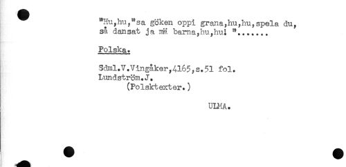 //// "Hu,hu;"sa göken oppi granaspela du, //// så dansat jam& bama,hu^hui //// ! - //// Polska. //// Sdjnl.V.Vingåker,4l65^s.51 fol. //// Lundström.J. //// (Polsktexter.) //// ULM A. ////
