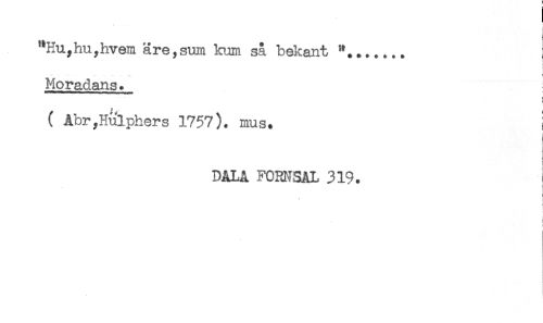//// '*Hu,hu.yhvem äre,sum kum så bekant //// - //// Moradans. //// ( Abr,Hulphers 1757). mus. } //// i //// t //// DALA FORMSAL 319. //// i //// < ////