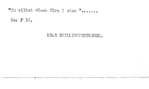//// "Hu vilket väsen förs i stan "....... //// Se: P 32. //// KB:S SKILIINGTRYCKSREG. ////
