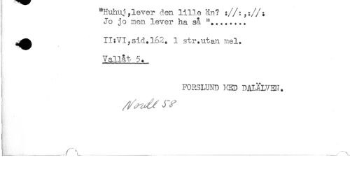 //// I "Huhuj,lever den lille än? ://:,://: //// ^ Jo jo men lever ha så //// ^^^ II:VI,sid.l62. 1 str.utan mel. //// Vallat 5. //// FORSLUND MED DAIÄLVE-1. ////