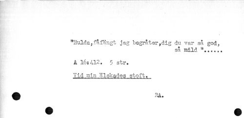 //// "Hulda,fåfängt jag begråter,dig du var så god? //// så mild //// A 16:412. 5 str. //// Vid min älskades stoft. ////