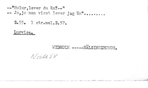 //// --"Hulur,lever du än?—" //// — Jo,jo men visst lever jag än".......,. //// 3*55. 1 str.mel.S.57. //// Lurvisa. //// NIDHOLM-----HÄLSINCERUNOR. ////