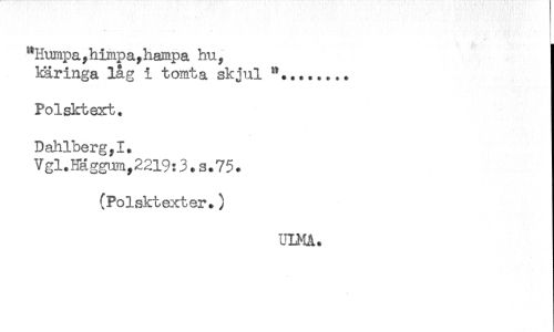 //// "Humpa, himpa, hampa hu, //// ^äringa låg i tomta skjul //// Polsktext. //// Dahlberg?I. //// Vgl.Häggw^2219:3.s.75. //// (Polsktexter.) //// ULMA. ////