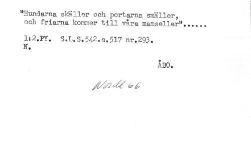 //// "Hundarna skäller och portarna smäller, //// och friarna kommer till våra mamseller"...... //// 1:2.PY. S.L.S.542.s.517 nr.293. //// N. //// ÅBO. ////