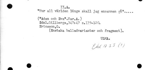 //// ! "Hur all världen länge skall jag ensammen gå"..... //// ("Adam och Eva".Var.A.) //// 3dml.Gillberga,347:47 s.119-120. //// Ericsson,G. //// (Enstaka balladvarianter och fragment). //// ULMA. //// - ////