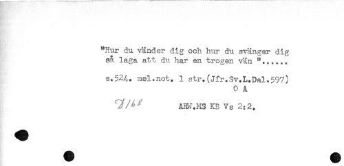 //// - //// . . < ' . ..'...'- . //// "Hur du vänder dig och hur du svänger dig //// så laga att du har en trogen vän "...... //// s.524. mel.not. 1 str.(Jfr.Sv.L.Dal.597) //// 0 A //// ' AHM.MS KB Vs 2:2. //// * ////
