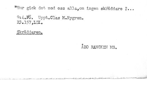 //// ''Hur gick det med oss alla,om ingen skräddare t!... //// Uppt.Clas M.Nygren. //// Skräddaren. //// ÅBO RANCKB? MS. ////